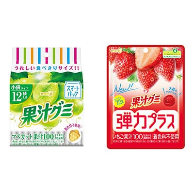 「果汁グミ」の小袋タイプとハードな噛み応えシリーズに新味が登場「果汁グミスマートパックマスカット」「果汁グミ弾力プラスいちご」3月11日、18日新発売 ~「果汁グミ」はくだもののフレッシュさを伝える新パッケージへ、3月4日よりリニューアル~