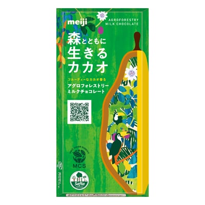 持続可能なカカオづくりを表現した新デザイン 商品のサステナブルな価値を伝える二次元バーコード付きで登場 おいしさも環境も考えたチョコレート「アグロフォレストリーミルクチョコレート」2025年4月15日 リニューアル発売/全国(一部経路除く)